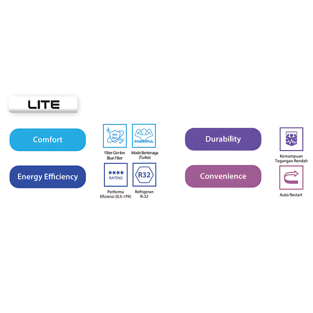 • Fitur Utama: Turbo/Powerful Mode (Fast Cooling), Wide Angle Louvers, Auto Restart, Remote Wireless