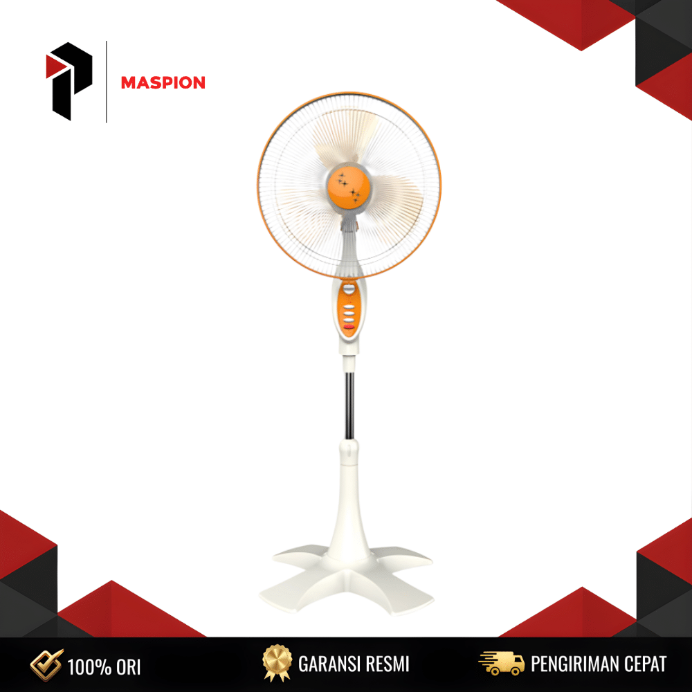 Maspion Stand Fan F-162ST 16 inch 45W dengan 3 kecepatan, osilasi, dan adjustable height—hembusan kuat untuk rumah dan area usaha, garansi resmi.